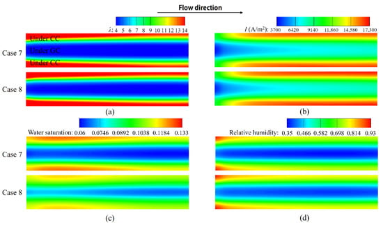 In this section, effects of the in-plane sandwich distribution of PTFE in the GDL are studied. Figure 8 compares the local distribution of the key variables for these two different designs in the middle plane of CCL. Along the flow direction, the dissolved water content decreases slightly for both designs as shown in Figure 8a due to the temperature rise. Careful observation will find that the dissolved water content of Case 7 is slightly lower than that of Case 8 near the outlet region. The slightly increased dissolved water content in Case 8 also improves its current density as shown in Figure 8b. In order to reveal the water retaining mechanism of these two PTFE doping strategies, the distribution of relative humidity and liquid water saturation in the middle plane of CCL is analyzed. Case 7 (less PTFE content under the rib) shows a higher liquid water saturation under the rib than Case 8 design as shown in Figure 8c. The lower hydrophobicity under the rib of Case 7 can help to keep more liquid water retained in the MEA. However, more liquid water is expelled under the GC for Case 7 due to more hydrophobicity of GDL thus leading to a more uneven distribution of liquid water saturation than Case 8. Although the maximum liquid water saturation of Case 8 is lower than Case 7, Case 8 shows a more uniform liquid water distribution and a higher liquid water content under the GC. Higher liquid water content under the GC evaporates to more water vapor under high temperature, which slightly improves the relative humidity under the GC to a certain extent as shown in Figure 8d. Due to a more uniform distribution of liquid water and water vapor in the CL of Case 8, the dissolved water content is slightly improved, which improves the current density of the fuel cell as shown in Figure 8b.