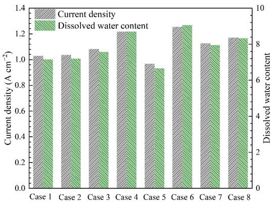 As discussed above, the doping strategies of PTFE have a significant influence on the distribution and coupling mechanisms of internal physical quantities of air-cooled fuel cells. The distribution of these physical quantities will eventually affect the performance of fuel cells. Figure 9 shows the comparison of current density of different doping strategies. In the above analysis, it is found that the dissolved water content in the CL has a significant impact on the performance of air-cooled fuel cell. Therefore, Figure 9 also presents the comparison of the average dissolved water content in the middle plane of the CCL. The air-cooled fuel cell performance shows a downward trend with the increase of the PTFE content in the uniform doping group as shown in Figure 9. The current density of Case 4 with 10% PTFE content in GDL is about 18.2% higher than that of Case 1 at Vcell = 0.6 V. The performance of through-plane PTFE doping designs presents two extreme states. Of various designs in the study, Case 5 has the worst performance, while Case 6 exhibits an outstanding performance. Compared with Case 1, the current density of Case 5 decreases by 6% and that of Case 6 increases by about 22%. The two sandwich doping designs (Case 7–8) show better performance compared with Cases 1–3 designs, but the performance is not as good as that of Case 4. In the study, the air-cooled fuel cell operated at 0.6 V, and the performance of fuel cell is mainly controlled by ohmic polarization. Ohmic polarization is affected by the proton transport process, and the proton conductivity is determined by the dissolved water content in the membrane. It can be found that there is an obvious positive correlation between the current density and the average dissolved water content in the CCL as shown in Figure 9. The design of GDL has an important impact on water retaining capacity, and then affects the performance of air-cooled fuel cells. The gradient PTFE doping strategy of Case 6 shows a higher water retaining capacity compared with the other designs as shown in Figure 9, thus improving the performance of air-cooled fuel cells as discussed above.