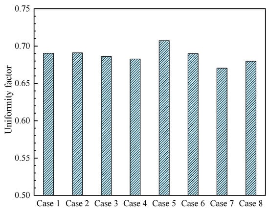 Figure 10 shows the comparison of the current density uniformity of various designs. Higher value of uniformity factor means a more uniform distribution of current density. The groups of PTFE uniform PTFE doping (Cases 1–4) and through-plane gradient PTFE doping (Cases 5–6) show relatively high uniformity, while the group of PTFE in-plane sandwich doping (Cases 7–8) shows a slightly lower current density uniformity. In-plane sandwich doping design produces differences of the wettability and porosity under the CC and GC respectively, which intensifies the uneven distribution of dissolved water content. The uneven dissolved water content will aggravate the uneven current density distribution of in-plane sandwich design. Compared with the in-plane sandwich doping designs, the current density distribution uniformity of PTFE uniformly doping design is slightly improved. With the decrease of PTFE content in the group of uniformly doping designs, the uniformity factor shows a decreasing trend. Case 5 shows a higher uniformity among various designs. This is because Case 5 has the worst water retaining capacity, thus leading to a small difference of dissolved water content under the CC and GC. Although the current density uniformity of Case 6 is not as good as that of Case 5, it is equivalent to that of uniform PTFE doping designs. Therefore, Case 6 design not only improves the fuel cell performance, but also maintains a good current density distribution uniformity.