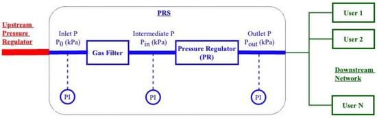 Over the years, the maintenance paradigm for physical systems has improved from reactive maintenance (fixing faults after they occur) to preventive (performing routine repairs), then predictive (predicting failures and then repairing them), and finally prescriptive maintenance (predicting failures and recommending action). PRSs are usually monitored for gradual health deterioration and abrupt faults. Hence, real-time monitoring and automated prescriptive maintenance are crucial for the smooth operation of GDNs. As seen in Figure 1, pressure can be measured at three locations: upstream of the gas filter, between the filter and regulator, and downstream of the PR. Most existing PRSs are sparsely instrumented. The intermediate pressure (Pin in Figure 1) is not measured in many PRSs. Most often, the data that are collected from PRSs are not automatically transferred to the respective control rooms. Depending on the availability of pressure and flow data, either model-based or data-based methods can be applied for PRS health monitoring.