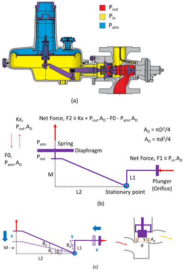 (a) A schematic of the HON 277 gas PR, (b) the torque balance for the lever-type PR (HON 277), and (c) the computation of the displacement of the lever and flow area.