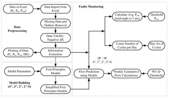 This section discusses the methodologies that were developed for fault monitoring in PRSs. Firstly, data preprocessing is discussed before addressing the potential faults in PRSs, namely filter choking, valve seat damage, and diaphragm deterioration. In general, gas distributors do not measure flows through PRSs. Furthermore, most gas companies only measure and . Figure 5 summarizes the methodologies that were developed to monitor the three faults (filter choking, valve seat damage, and diaphragm deterioration).
