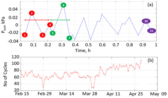 Figure 6. (a) The number of cycles in one hour (1, 2, …21 are the local minimum and maximum values) and (b) the daily number of cycles. - Determine the number of cycles per day using (maximum and minimum values − 1)/3 (Figure 6b);