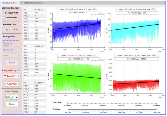In this study, the PR Group 2 contained 15 PRs: RG2_1, RG2_2, …, RG2_15. Each PR had data for different dates, as shown in Figure S3 in the Supplementary Materials. In total, 10 of the 15 PRs were chosen for analysis and then the “Analyze Group” button was clicked. In total, there were 404,694 data points for the 10 PRs. The PRHM dashboard showed the progress of calculations and error messages (when applicable). In the case of error messages, it provided suggestions for how to resolve the errors. The PRHM took about 7 minutes to analyze the 10 PRs using a Windows workstation with 16 GB of RAM and a i7 7700 CPU at 3.60 GHz. After completing the analysis, the PRHM showed three tables for the filter RUL, the creep effect (valve seat) RUL, and the annual diaphragm usage (Figure 7). Users could choose a PR from the drop-down list under the “Plots Display” menu to visualize the pressures and flows. In Figure 7, the inlet pressure, intermediate pressure, outlet pressure, and gas flow data are shown for RG2_5. The sliders below the plots could be used to adjust their display time windows.
