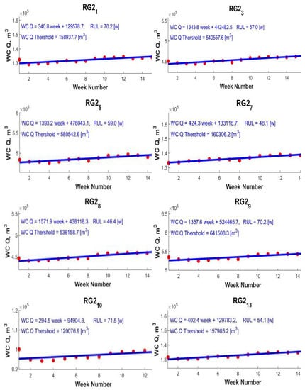 As explained previously, the weekly cumulative flow through a PR is used to monitor filter choking. Figure 8 presents the plots for the weekly cumulative flow against time for eight selected PRs (RG2_1, RG2_3, RG2_5, RG2_7, RG2_8, RG2_9, RG2_10, and RG2_13). For these PRs, the weekly cumulative flow increased monotonically.