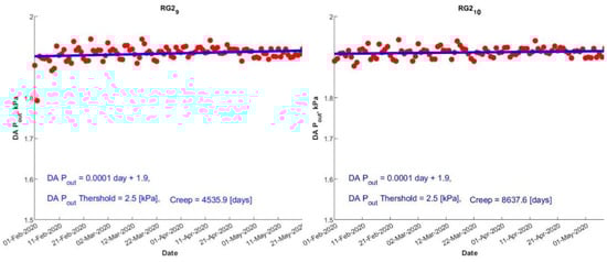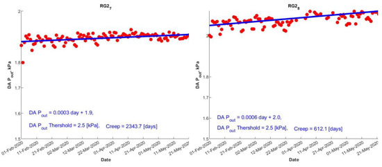 Figure 9 presents the average Pout values (12 am to 3 am) for several days. The average daily Pout value only increased for RG2_7, RG2_8, RG2_9, and RG2_10. The Pout values are expected to increase for damaged valve seats; hence, it could be concluded that the other PRs had no issues with their valve seats. The fitted lines for various PRs are shown in Figure 9. Table S3 in the Supplementary Materials shows the confidence intervals for the intercept and slope of the lines. The confidence intervals were only computed for lines with positive slopes and the line parameters were statistically significant (except RG2_10, which had a lower confidence interval because the slope was negative). The threshold value of the average daily Pout was 2.5 kPa. The RUL for each valve seat can be seen in Figure 9 and Table 2.