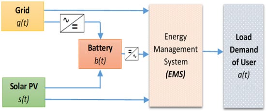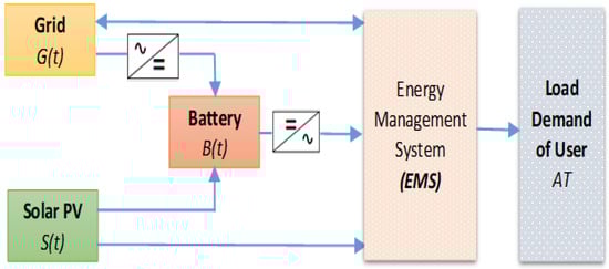The schematic layout in Figure 2 consists of a grid-connected solar PV-based energy management system (EMS). Solar-produced energy is kept stored in the battery which is converted to AC power using a highly efficient inverter. The grid connection is bidirectional for purchase and selling purposes. All sources are fed to the EMS which decides at which time the path will be utilized to fulfill the load demand and at which time battery charging and discharging will be carried out keeping in view the objective function. The overall net cost of purchased and sold energy is formulated with a one-day model. A day is divided into T times according to an hourly basis. Therefore, 24 values of each decision variable are provided except for the battery. The battery’s initial state of charge at t = 0 is the initial state of charge (SoC) which is denoted as eINI, whereas t = T + 1 will be the final state of the battery which will be the 25th value in this case. Thus, the objective function with minimized grid intake can result in a benefit to the end-user of the microgrid.