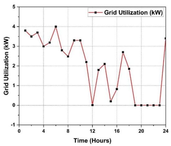 In the off-grid model, there is a unidirectional energy transfer from the grid. The energy produced by solar PVs will be utilized to fulfill the load demand. Grid costing is based on off-peak and on-peak timing. Batteries are charged via solar and grid as per energy saving and optimization techniques. The optimizer will utilize batteries during on-peak timing to reduce the grid electricity bill and recharge through solar PV and grid in off-peak timing. The off-grid model was modeled in MATLAB, and graphical results were extracted from each decision variable. The grid utilization with respect to each hour of a day is presented in Figure 3. The battery is consumed for load fulfillment shown in Figure 4 during on-peak hours when grid cost is high as mentioned in Table 1. Battery states of charge (SoCs) of each hour are shown in Figure 5. SoC scaling factor (x/10) is used, i.e., 20 = 2 KW. Solar utilization for load requirement and total solar generation with utilization as per the EMS optimizer schedule are shown in Figure 6.