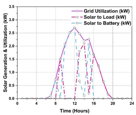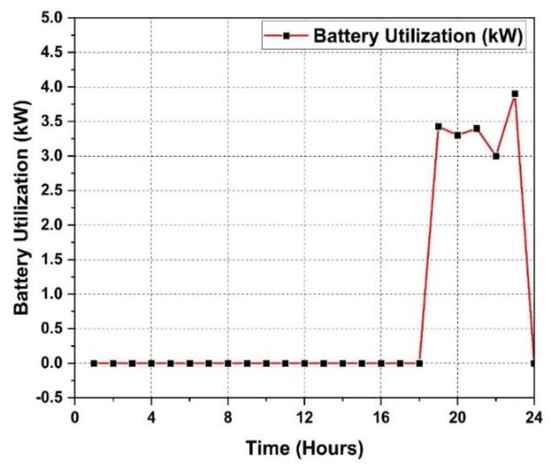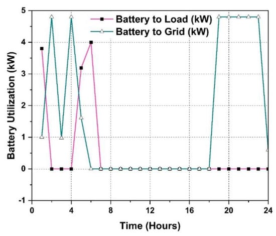 In the on-grid model, there is a bidirectional energy transfer from the grid. The energy produced by solar PVs will be utilized to fulfill the load demand along with selling back to the grid via batteries. Grid costing is based on off-peak and on-peak timing. Batteries are charged via solar and grid as per energy saving and optimization techniques as in the off-grid model. The grid utilization with respect to each hour of a day is presented in Figure 8. During on-peak timing, the battery is maximally utilized to sell back energy to the grid keeping in view the overall reduction in grid cost. The battery utilization profile is shown in Figure 9. Battery states of charge (SoCs) of each hour are shown in Figure 10. SoC scaling factor (x/10) is used as in the off-grid model, i.e., 20 = 2 KW. Solar utilization for load requirement and total solar generation with utilization as per the EMS optimizer schedule are shown in Figure 11.