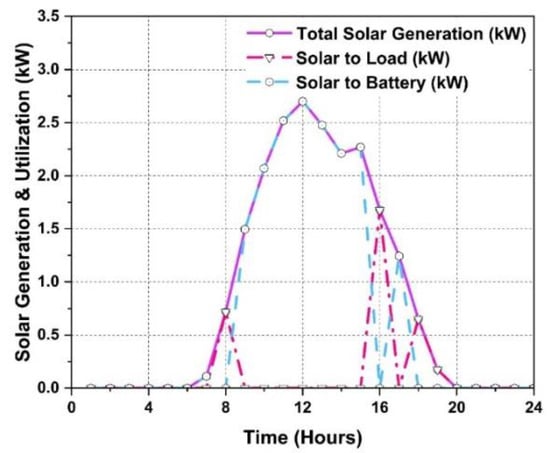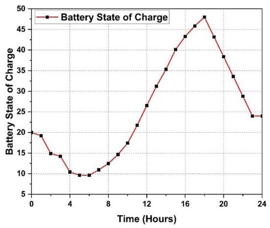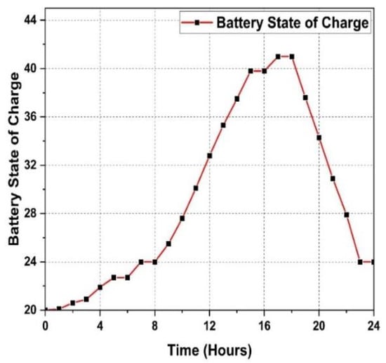 For one-day modeling and analysis, we used values on an hourly basis of a day. In this way, 24 values per day were considered for each parameter and decision variable. We defined 24 h load and solar generation data for the model and placed them in variables (at) and (st), respectively. For the battery’s efficient usage and to enhance its life, we applied an algorithm in which 10% of the charging and the discharging rate is allowable in any hour interval. In these charging and discharging cycles, the battery will smoothly charge and discharge rather than getting a sudden charge or drain which affects the battery life. The permissible minimum discharging of battery is 33.3% of total capacity.