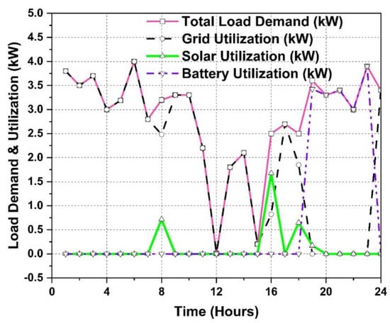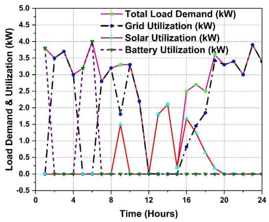 Load is directly fed through the EMS which decides the source path which needs to be triggered for the fulfillment of the load demand. A detailed analysis of total load and resource utilization in every hour is shown in Figure 12 for the on-grid model.