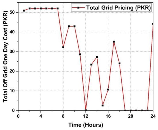 For the off-grid model, the optimizer evaluated the cost charged by the grid of a day as PKR 677.08 of household load as shown in Figure 13. During on-peak timing when grid cost is higher, the part of energy shared by the grid is very low, and in off-peak timing, the grid utilization is higher keeping in view the low cost of the grid. Meanwhile, in the on-grid model, with the same load and solar generation, the optimizer-generated cost of a day is PKR 467.08 as shown in Figure 14.