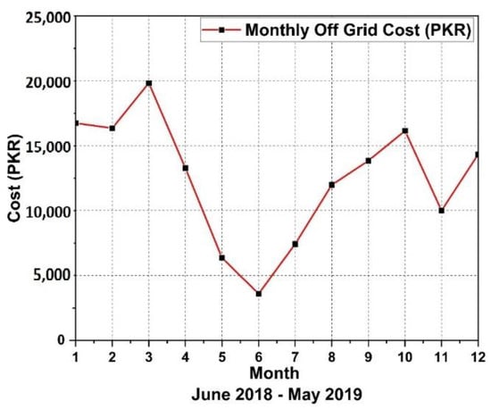 The load and solar data of the complete year profile for analysis started in June 2018 and ended in May 2019. Month-wise billing and seasonal impacts on the bills are clearly understandable in Figure 15 and Figure 16 for the off-grid and on-grid models, respectively.
