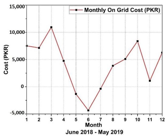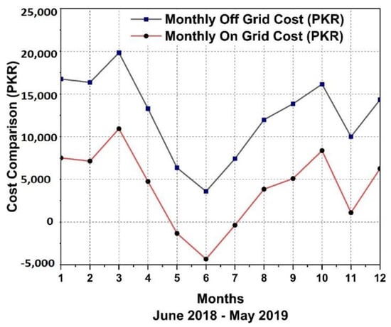Figure 17 indicates that the proposed scheme results in an optimized and low cost for the on-grid model throughout the year, and it is an optimum strategy for the implementation of residential microgrids. For instance, grid costing for the month of Jun-18 is PKR 16,755 by using the off-grid model, whereas the on-grid model costing is PKR 7511 only for the same month with the same load profile. Overall, the results specify that the daily average saving is about 32.0% by using the proposed on-grid scheme, where an FiT does exist.