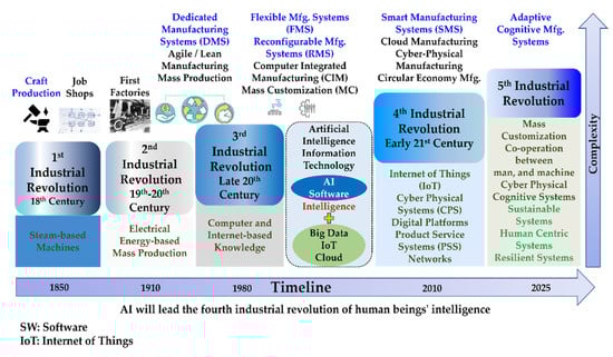 Industrial Revolutions with key milestones and significance of AI towards human beings’ intelligence (derived from [7,8]).