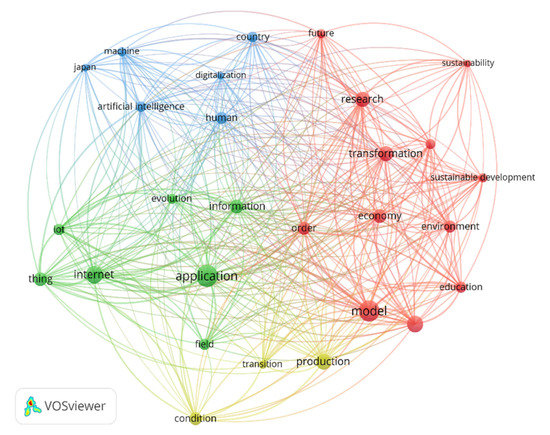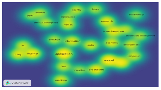 Figure 3 illustrates the breadth of research on the subject. Essentially, the visualization of Figure 3 serves as a heatmap for unveiling the trends in which researchers are working on more frequently. Consequently, by the findings of the literature, it can be concluded that there is a lot of discussion about IoT, Application, Human, AI, Transformation, Economy, Education, and Sustainable Development.