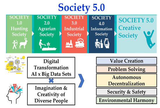 - Shiroishi, Y.; Uchiyama, K.; Suzuki, N. Society 5.0: For Human Security and Well-Being. Computer 2018, 51, 91–95. [Google Scholar] [CrossRef]