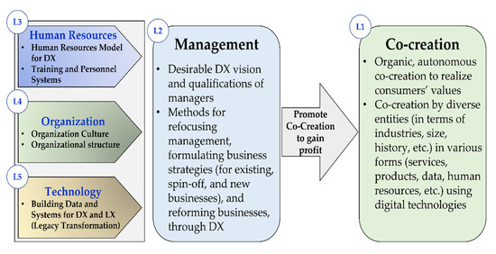 The change provoked by DX is not merely technological. It represents a significant shift in the lower level of society and culture, altering social norms. DX goes beyond straightforward labor-saving “kaizen”, automation, increased productivity, and digital technology-based optimization. In response to significant social changes, DX is reform that aims to establish new values, sometimes at the expense of preexisting ones. Therefore, it can be stressed that DX is a shift that alters the foundation of society and business, going beyond simple IT system modifications. Consequently, DX should be the top management priority for businesses, and they should work on it voluntarily and pro-actively [32]. The definition of DX in the Keidanren proposal is as follows: