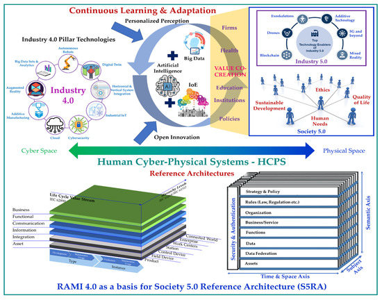 Industry 5.0 and Society 5.0 conceptual framework based on the integration of Industry 4.0 reference architecture model and technologies.