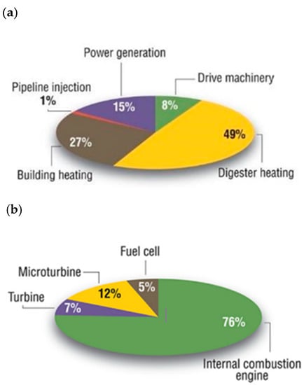 Percentages of (a) biogas utilization technologies in use at WWTPs producing biogas [27]; (b) electricity generation technologies in use at WWTPs that produce biogas.