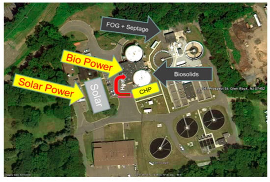 An alternative source of electricity for WWTPs is the combination of two sources of renewable energy—biogas and solar panels, in which part of the WWTP energy consumption is covered using a cogeneration biogas unit and the rest is covered by solar panels. Due to the huge areas where WWTPs are located, it is not a problem to find a place for solar panels. For example, this can be the roofs of the operating facilities at the WWTP. Some WWTPs optimize biological processes and cover activation tanks. The roofs of these can also be a very convenient place to place solar panels. Another requirement involves suitable batteries to store the electricity produced. This concept works, for example, in Ridgewood, New Jersey (Figure 3) [31].