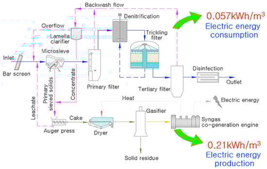 Some calculations show that it is possible to produce even more electricity from biogas than the WWTP requires. The most important task is to reduce the consumption of aeration turbochargers as much as possible. This means eliminating aeration needs as much as possible. The first place where this can be done involves a big improvement in primary solids removal using advanced technologies during microsieving and filtration processes; for example, a proprietary rotating fabric belt MicroScreen and a proprietary Continuous Backwash Upflow Media Filter or cloth media filter. With these technologies, a reduction of 80–90% can be achieved in TTS (total suspended solids) and 60–70% in BOD5 (5-day biochemical oxygen demand). In the next step, a combination of low height trickling filters with encapsulated denitrification can be used for the removal of the remaining BOD and nitrogen. The primary solids removal process produces biosolids that can be dried by an auger press to about 55% solids, and then partially thermally dried to about 80% solids. In the end, biosolids are used in a gasifier for the co-production of thermal and electrical energy through syngas combustion in a co-generation engine. Alternatively, biosolids may undergo anaerobic digestion to produce biogas and then thermal and electric energy. The energy requirements for complete wastewater treatment per volume of inlet raw wastewater have been calculated at 0.057 kWh/m3, (or 0.087 kWh/m3, if UV disinfection has been selected). The potential for net electric energy production through gasification/co-generation per volume of inlet raw wastewater has been calculated at 0.172 kWh/m3, or even 0.210 kWh/m3, as presented in Figure 5. If we are able to use such technologies in practical applications, then WWTP could be changed from a consumer to a producer of electricity [14].