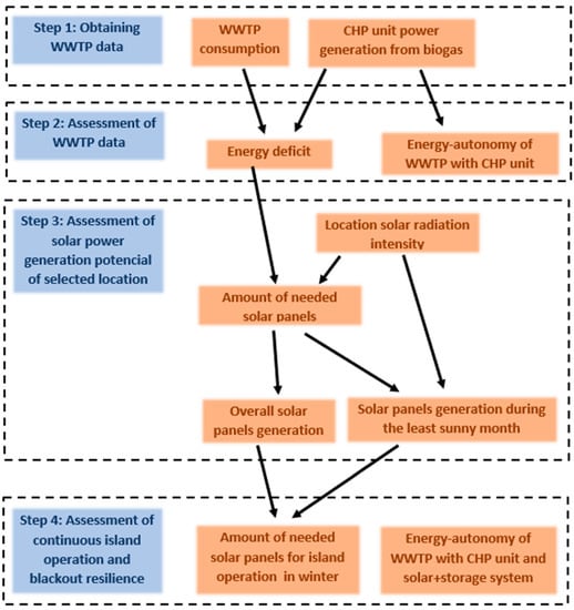 Most wastewater treatment plants have the potential to switch to island operation during a blackout. The smaller ones can be supplied by diesel engine-generators. The use of renewable sources appears to be advantageous, especially with the option of using biogas, especially for large WWTPs, which produce biogas in the fermentation process. However, most of these are not able to work in island operation for a long time (more than two days), because the consumption of turbochargers would not be covered and the development of biogas would decrease. This can be solved by a diesel engine-generator that would supply electricity to the turbochargers, or by installing sufficient solar panels with battery storage for the same purpose.