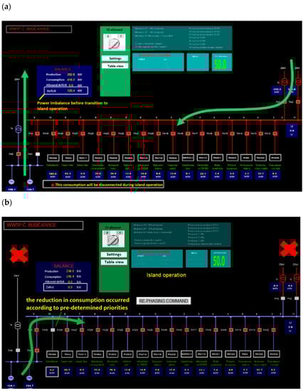 Control system screen during: (a) normal and (b) island operation of a WWTP [39].