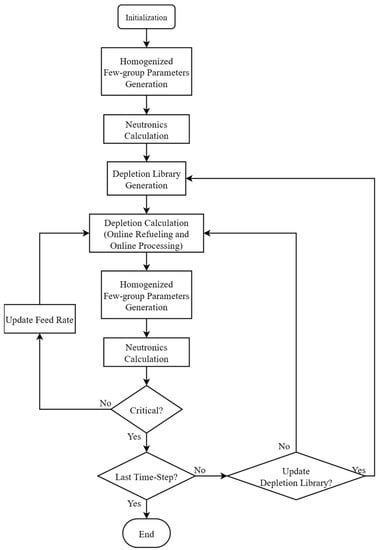 The calculation flow scheme of the ThorNEMFM code is shown in Figure 1. The homogenized few-group parameters are generated before neutronics calculation. Then, the neutronics calculation and depletion calculation are carried out. It should be noted that the criticality in the reactor is achieved by adjusting the feeding rates of fissile and fertile materials. The depletion library is updated regularly based on the fuel salt composition at the user-specified time points.