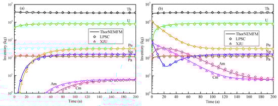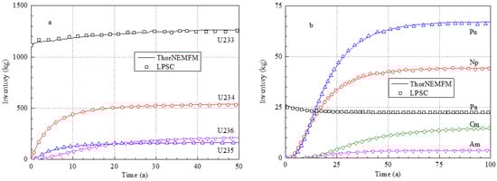 Figure 4a shows the buildup of uranium isotopes, while Figure 4b shows that of the other actinides. The numerical results of the ThorNEMFM code are consistent with the LPSC results [22]. The inventories of heavy nuclei at equilibrium state are listed in Table 2. The short-half-life nuclides (below 10 h) are deleted in burnup calculation in LPSC, which makes the difference between the two codes.
