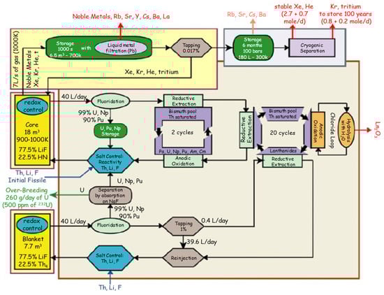 The standard MSFR is a 3000 MWth fast-spectrum MSR based on the thorium fuel cycle. The MSFR was performed using a binary fluoride salt LiF-(heavy nuclei)F4 at a 77.5–22.5 mol% ratio. The total fuel salt volume was 18 m3, and was distributed half in the core and half in the external circuit. The radial reflector included a 50 cm thick fertile blanket and a 20 cm thick B4C reflector. Two kinds of starting modes were employed in this simulation: one was an MSFR directly started with 233U as the initial material, and the other used the TRU elements contained in a UOX (60 GWd/ton) fuel after one use in a PWR and 5 years of storage. The fuel salt completed a full cycle in 3.9 s, with a mean temperature of 750 °C. Figure 5 shows the overall scheme of the fuel salt reprocessing system, including a salt control unit, an online gaseous extraction system, and an offline lanthanide extraction component via pyrochemistry. The rare gases and some noble metals were extracted with a removal period of 30 s. A fraction of salt (40 L per day) was periodically withdrawn and reprocessed offline in order to extract the other FPs. The FPs of the fertile blanket were slowly removed at a rate of 0.4 L per day. During MSFR operation, the HN fraction was kept constant and the produced FPs replaced an equivalent proportion of the lithium.