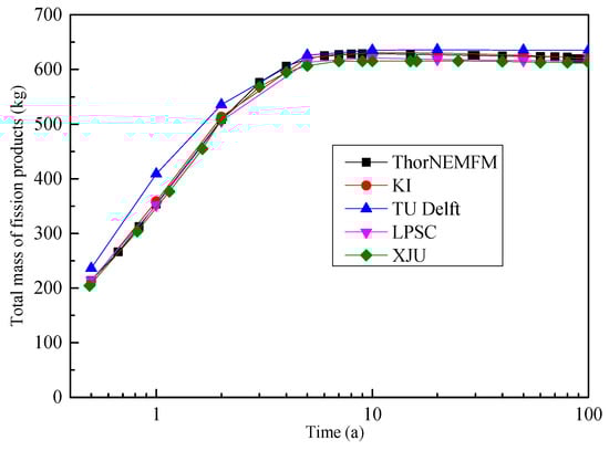 The amounts of the heavy nuclei initially loaded in the 233U- and TRU-started MSFRs are detailed in Table 4. The evolutions of heavy nuclei inventories calculated by ThorNEMFM are given in Figure 6. As is shown in the figure, the numerical results of the ThorNEMFM code are in good agreement with the results of XJU and LPSC. The differences were mainly caused by the adoption of different nuclide cross-section data libraries. The inventories of heavy nuclei at equilibrium state in the 233U-started MSFR are listed in Table 5 [19,24]. The results of ThorNEMFM are in between the results of LPSC and TU Delft. The FPs’ extraction can be verified by calculating the total mass of FPs in the 233U-started MSFR as a function of time, as shown in Figure 7. The ThorNEMFM results are consistent with the results of other institutes [18]. The equilibrium mass of FPs is 620 kg, and it takes about 6 years to reach the equilibrium state.