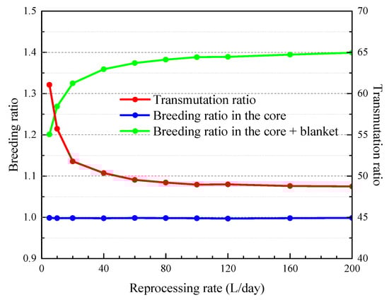 Influence of the reprocessing rate on the breeding ratio and transmutation ratio.