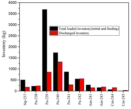 Figure 10 shows the total loaded and discharged inventories of TRU nuclides. The inventories of 237Np, 239Pu, 240Pu, 241Pu, and 241Am significantly reduce after 100 years of operation, and their transmutation mass is about 300 kg, 2800 kg, 400 kg, 500 kg, and 100 kg, respectively. The inventories of 238Pu, 242Pu, 243Am, 244Cm, and 245Cm increase by about 18 kg, 12 kg, 26 kg, 89 kg, and 21 kg, respectively.