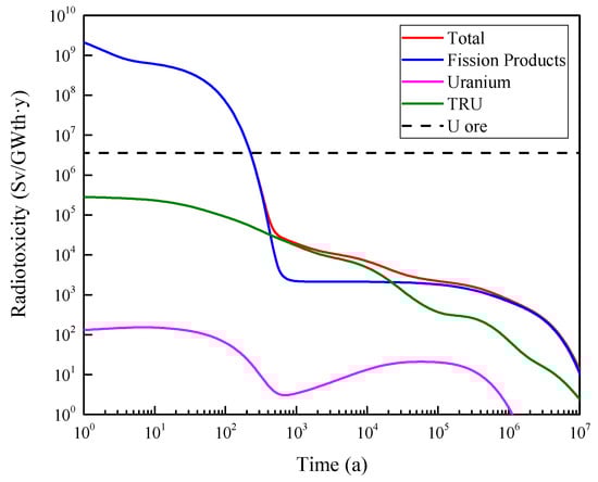 The radiotoxicity of FPs during online reprocessing has a non-negligible impact on the final repository. A loss rate of 10−5 for TRU elements and 10−7 for uranium isotopes is assumed during reprocessing. Figure 13 shows the evolution of radiotoxicity of nuclear waste. The radiotoxicity drops to the radioactivity level of natural uranium ore within 300 years.