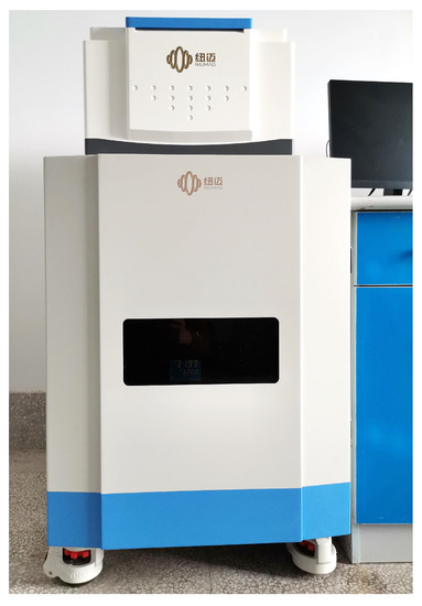NMR experiments were performed using the NMR analyzer MicroMR12-025V manufactured by Suzhou Niumag Analytical Instrument Corporation, as shown in Figure 1. The resonance frequency was 12 MHz, magnetic field intensity was 0.28 T, and the magnet temperature was controlled at 35 ± 0.02 °C. In order to avoid signals loss from smaller pores, the echo spacing TE was set at 0.1 ms, and waiting time Tw at 3000 ms, the number of echoes was set at 1024, and the number of scanning and stacking was set at 128. Test solutions included simulated formation water with different salinities and aqueous solutions with concentration-varied surfactants.