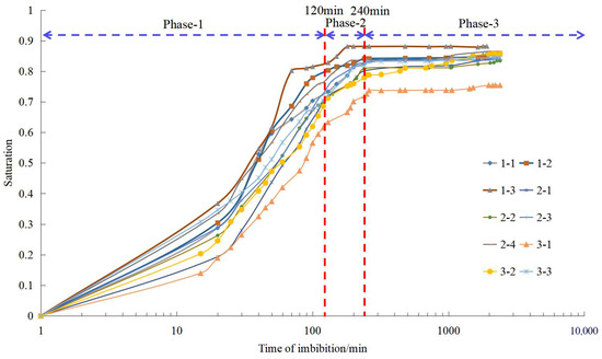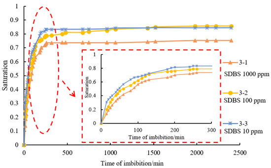Figure 7 shows the order of 3-1 < 3-2 < 3-3 in accordance with shale core imbibition rate and capacity, which means imbibition rate and capacity decrease with increasing surfactant concentration (the SDBS concentration of the imbibition solution for shale core 3-1 is 1000 ppm, the SDBS concentration of the imbibition solution for shale core 3-2 is 100 ppm, the SDBS concentration of the imbibition solution for shale core 3-3 is 10 ppm). As per the analysis, the surface tension of the solution will significantly decrease when surfactant concentration goes up, leading to remarkably decreasing capillary force and driving force of imbibition.