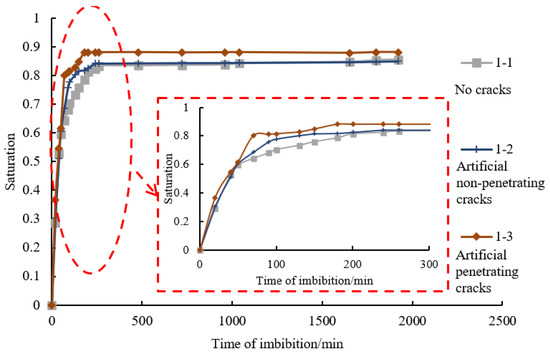 Figure 5 shows the order of 1-1 < 1-2 < 1-3 in accordance with shale core imbibition rate and capacity, which is reconciled with the order of fracture density of shale cores being investigated (shale core 1-1 with no cracks, shale core 1-2 with artificial non-penetrating cracks, shale core 1-3 with artificial penetrating cracks). This means that imbibition rate and capacity increase with increasing fracture density, and fractures facilitate the imbibition of fracturing fluids. In accordance with the analysis, capillary force and hydration mainly occur close to the contact with fluid media. Fluids cannot intrude deeply along the contact surface. As fracture density increases, the area of imbibition, and consequently imbibition capacity and rate increase accordingly. Hence, the area of imbibition has an important effect on imbibition capacity.