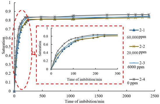 Figure 6 shows the order of 2-1 < 2-2 < 2-3 < 2-4 according to shale core imbibition rate and capacity, which means imbibition rate and capacity decrease with increasing salinity of the solution (the water salinity of the imbibition solution for shale core 2-1 is 60,000 ppm, the water salinity of the imbibition solution for shale core 2-2 is 20,000 ppm, the water salinity of the imbibition solution for shale core 2-3 is 6000 ppm, the imbibition solution for shale core 2-4 is deionized water). According to the analysis, water intake by shales, which are a type of clay-bearing porous media, is mainly dependent on capillary force and hydration. Clay hydration includes surface hydration and osmotic hydration. High salinity could inhibit clay hydration and decrease the chemical potential difference and driving force of imbibition.