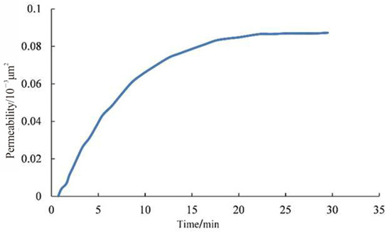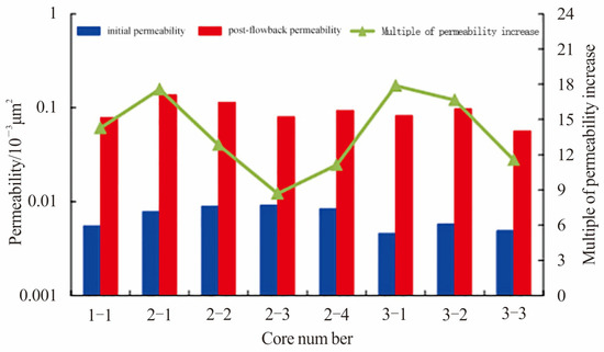 Permeability change during imbibition flowback of gas displacing water was recorded in real time, as shown in Figure 8. Permeability first increased quickly with decreasing water saturation and then became stable. Figure 9 compares initial permeability with post-flowback permeability, and the latter is universally larger than the former. In the area of interest, core permeability increased by 8.70–17.88 times with the average of 13.83 times.