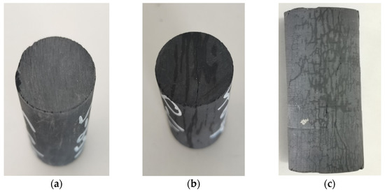 The core before and after imbibition flowback (a) dry core; (b) end face of the core after flowback; (c) surface of the core after flowback.