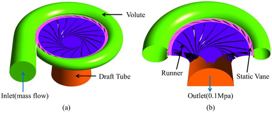 As shown in Figure 1, this paper selected a hydraulic turbine as the research object. The hydraulic turbine consists of the volute, static vane, runner, and draft tube. The parameters of the hydraulic turbine are listed in Table 1. In this paper, the flow field and performance of the hydraulic turbine are numerically simulated using different gas models under variable IGVFs (5%, 10%, 15%, 20%).