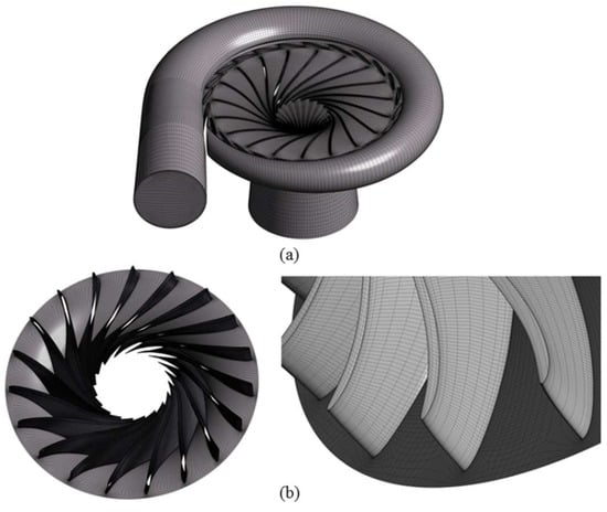 The grid of the hydraulic turbine: (a) global grid; (b) runner’s grid.