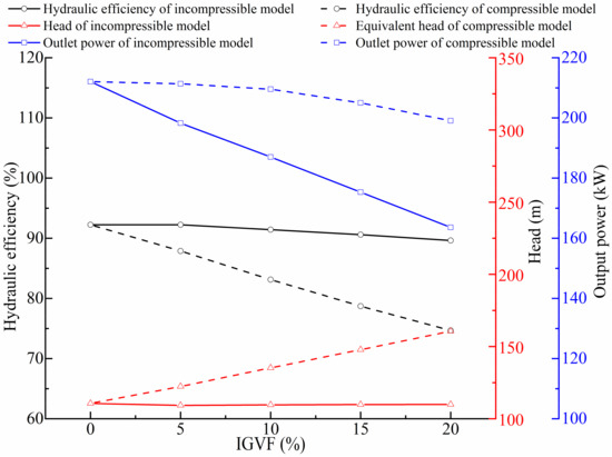 The external characteristics of the hydraulic turbine predicted by the compressible and incompressible models under different IGVF conditions are shown in Figure 4. The hydraulic efficiency and output power of the hydraulic turbine are the largest under pure liquid conditions. At this time, the hydraulic turbine has a solid ability to recover the residual pressure energy of the pressurized liquid. Two kinds of gas models predicted significant differences in the output power, head, and hydraulic efficiency. The changing trend is also different. The head for incompressible gas was calculated by Equation (6). The calculating pressure difference at the inlet and outlet continuously decreases with the increase in the IGVF. However, as the mixture density decreases with the IGVF, its head changes slightly. When the compressible gas model is used, the equivalent head consists of the gas-phase head and liquid-phase head, as shown in Equation (18). Both the liquid and gas heads decrease with the IGVF. Nevertheless, the gas head is far higher than the liquid head under the same pressure difference due to its expanding work and small density. Thus, the equivalent head increases with the IGVF and is 46% higher than the incompressible model at an IGVF of 20%.