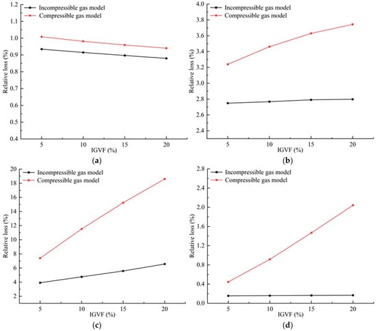 Figure 5 shows the variation curves of the relative loss in each part of the turbine predicted by two gas models. At the same IGVF, the relative loss predicted by the compressible gas model is more than the incompressible gas model. The main reason is the loss of expansion work and the influence of gas compressibility on the liquid flow field.