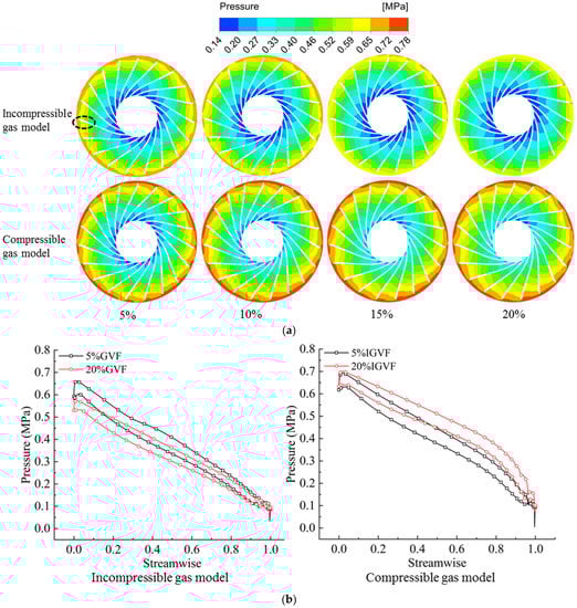 In contrast, in the compressible results, the low-pressure zone decreases with the IGVF. In Figure 6b, the pressure curve at 20% IGVF is higher than that at 5% IGVF. The reason is that the gas expands in the blade passage with the pressure reduction. At the same time, as the gas volume increases, the reduction rate of the pressure decrease.