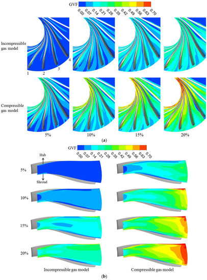GVF distribution predicted by different gas models: (a) part of the runner’s flow passage; (b) blade working surface.
