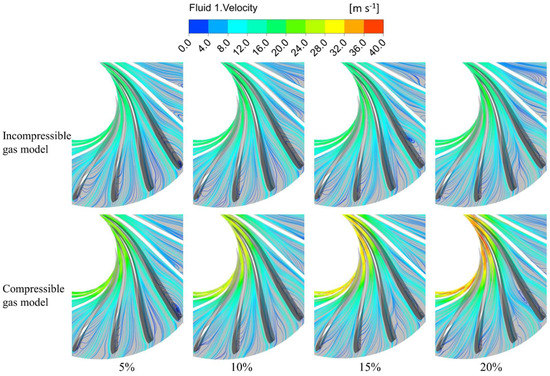 Figure 8 shows the liquid phase velocity and streamlines in the runner at variable IGVF when the incompressible and compressible models were used. It can be seen that the liquid accelerates in the runner flow passage, and the flow velocity on the suction surface is larger than on the working surface of the blade. The reason is that the water impacts the working surface of the blade, causing phenomena, such as flow separation, and vortices on the working surface. As a result, most fluid flows along the suction surface, resulting in a higher flow velocity.