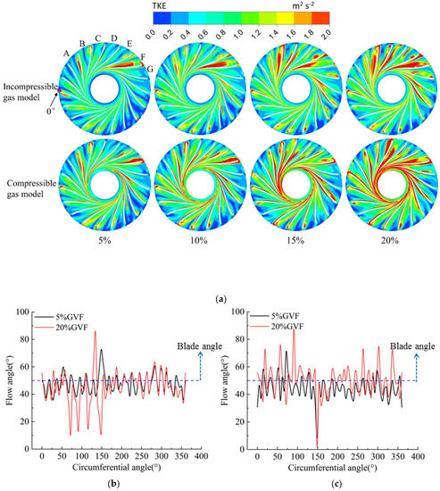 TKE distribution predicted by different gas models: (a) TKE distribution; (b) liquid flow angle distribution at runner inlet predicted by the incompressible model; (c) liquid flow angle distribution at runner inlet predicted by the compressible model.