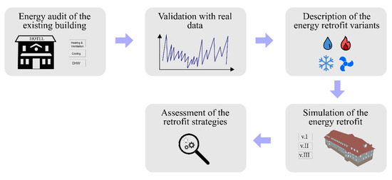 An increasingly common method for optimizing energy consumption in buildings is energy simulation [15,16,17,18,19]. In their paper, González-Gil et al. [20] presented simulations using a specially developed and calibrated dynamic energy model. The results allow them to determine the average energy intensity of operating rooms and the potential for energy savings of 40% to 80%. In addition, they found that heating accounts for about 98% of the total heat demand, with about 80% of consumption corresponding to periods of inactivity. The topic of improving energy performance was also addressed in an article by Díaz-Torres [21]. Based on their calculations of thermal loads, they determined the efficiency of installations inside the hotel and found opportunities for improving energy performance, leading to energy, cost, and environmental impact savings. The analysis found that due to the nature of the load, changing the operating strategy of the heating, ventilation, and air conditioning (HVAC) system could result in total savings of 403.1 MWh/year, which is the average consumption of the hotel for three months. Various retrofit scenarios using simulation tools were also analyzed by Biserni et al. [22]. A residential building in northern Italy was examined for three retrofit scenarios: I: replacing windows; II: increasing exterior wall insulation; and III: replacing windows, and increasing wall and roof insulation. Optimization was carried out using TRNSYS software, and calibrated based on energy bills. Based on the analysis, the most cost-effective solution was to increase exterior wall insulation. A similar approach was used in a paper by Silenzi et al. [23]. The authors evaluated the energy requirements for both heating and cooling systems. The analysis included various retrofit solutions, including façade-void-insulated panels, smart rotating windows, and LED systems. Due to high solar gains and relatively high temperatures, smart rotating windows proved to be the most cost-effective solution. An educational building in Italy is the subject of an article by Ascione et al. [24]. The authors conducted an analysis, in which the most cost-effective energy retrofit configurations include the installation of an air-source heat pump for space heating and a photovoltaics (PV) system distributed throughout the roof. According to the analysis, implementation of the best solution may result in a decrease in the primary energy demand value of about 12 kWh/m2a. Cho et al. [25] described the method of a historical building retrofit. For this purpose, the authors used the DesignBuilder simulation program. Possible retrofit solutions considered in this study include passive and active measures, as well as renewable energy technologies. Replacement of windows, use of roof and wall insulation, interior blinds, LED lighting, and a high-efficiency HVAC system was considered the optimal solution to reduce the energy intensity of the building while maintaining its historical value and utility. Using one of the retrofit proposals reduced Underwood Hall’s average energy consumption by 54.2% in winter and 42.6% in summer. It also reduced Underwood Hall’s annual energy costs by 47.9%.